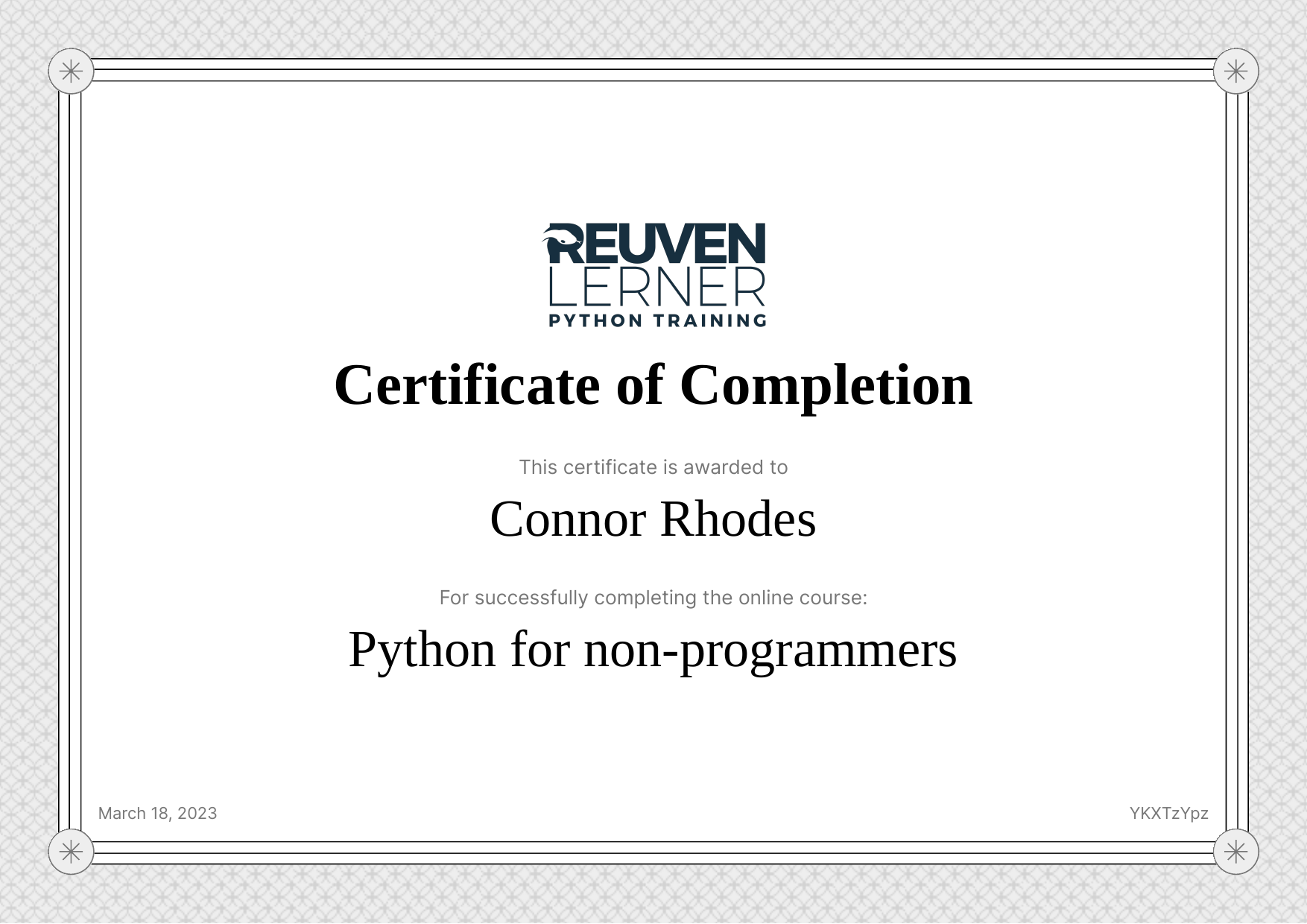 I recently completed Reuven Lerner’s course on Python for non-programmers . Python for non-programmers introduces new programmers to Python with a focus on data manipulation and analysis. About half the course consists of building increasingly complex scripts to build new datasets or parse existing data from user input or files on disk.